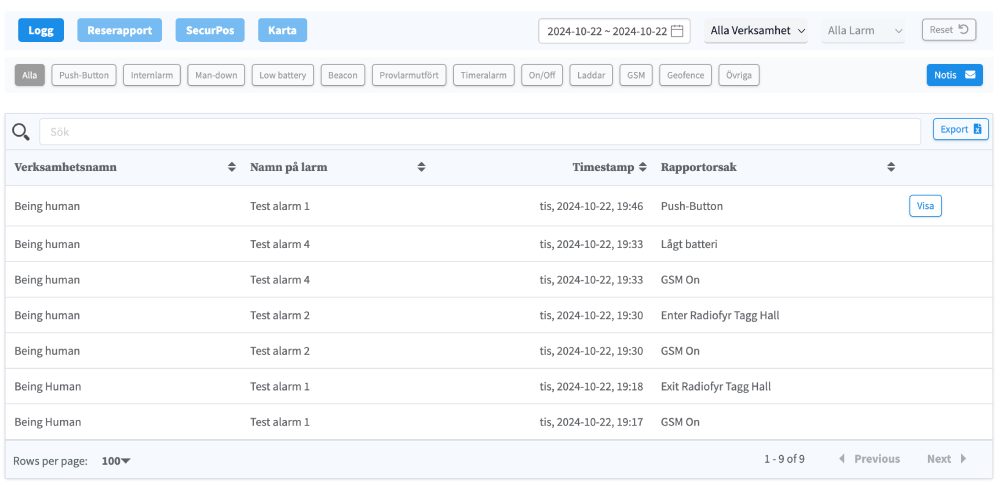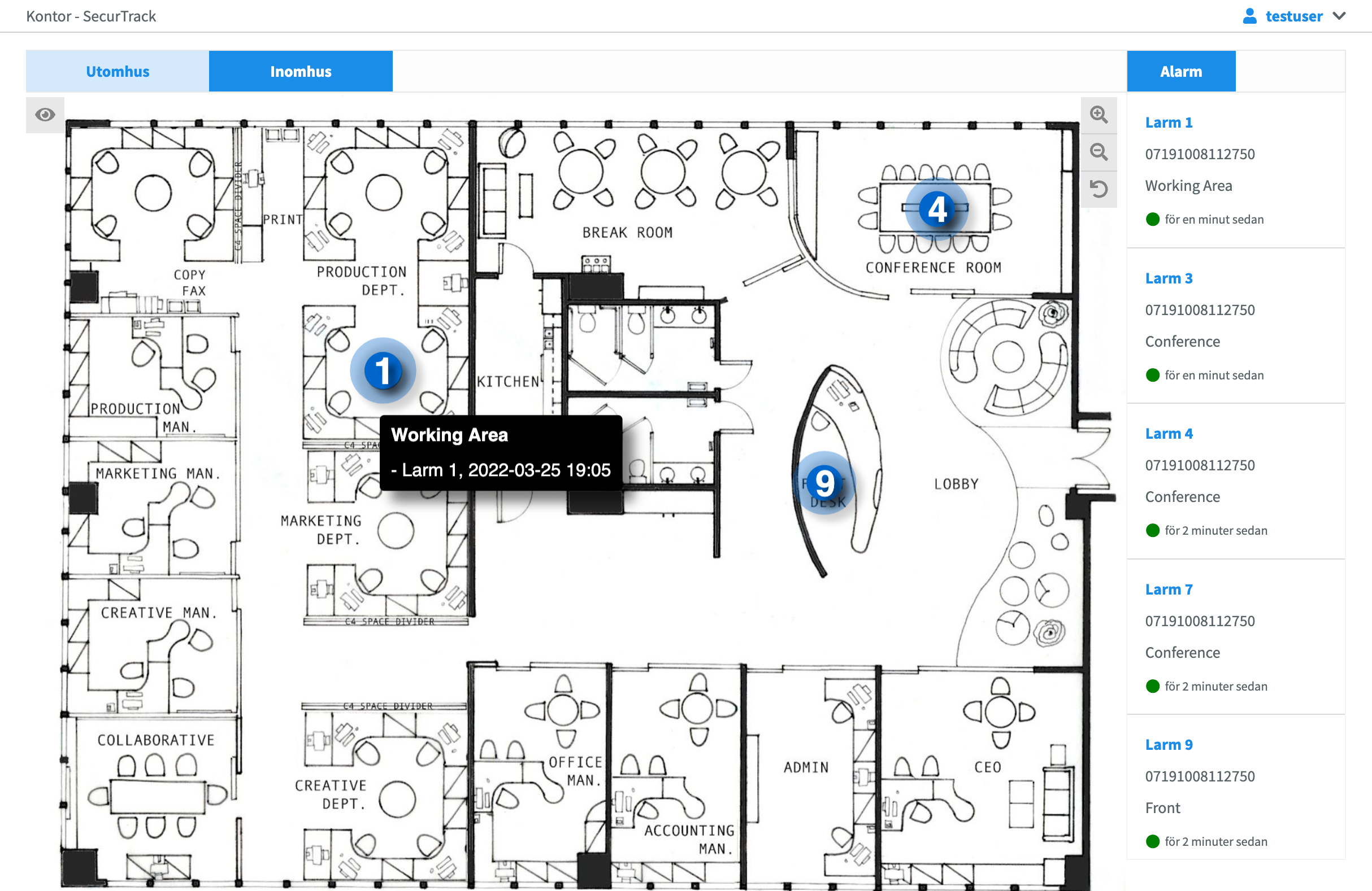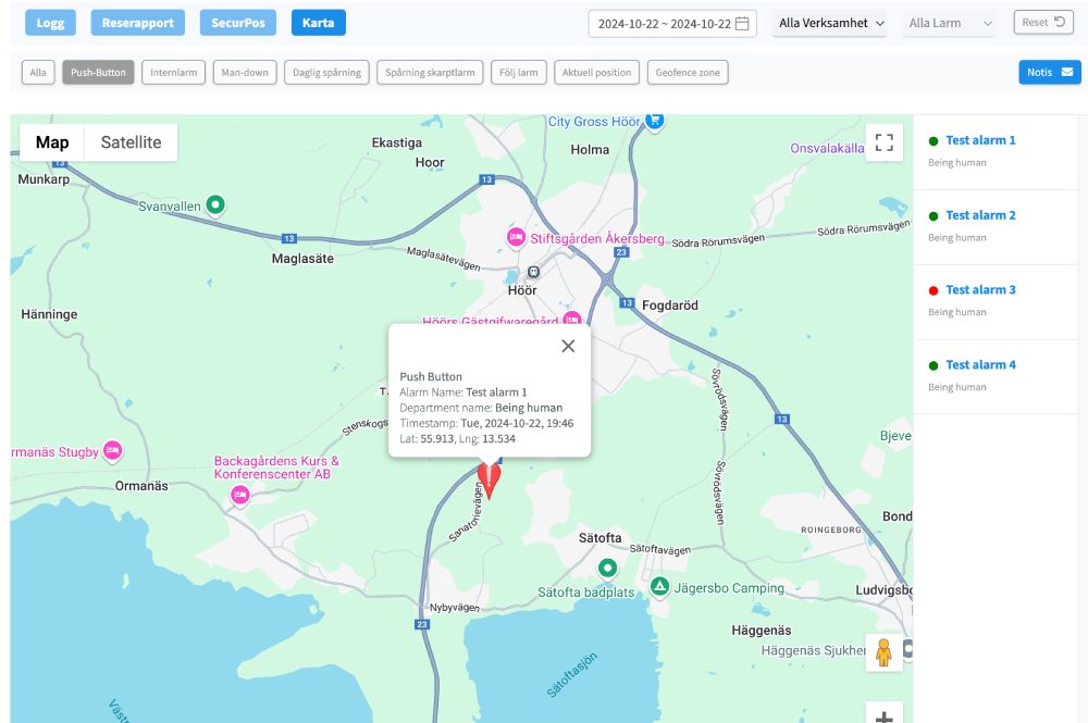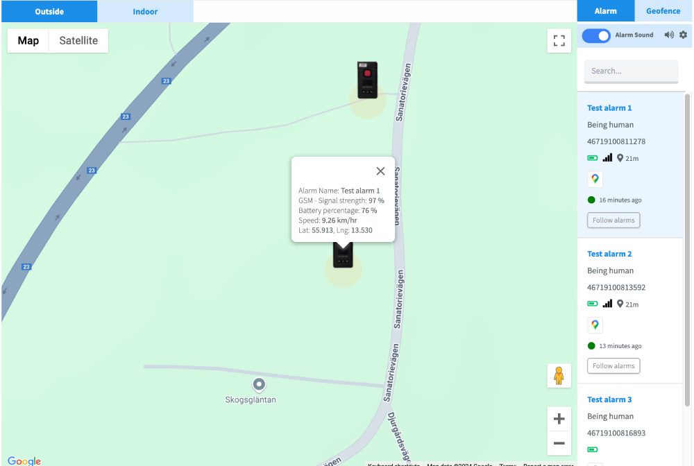 Hvis det er behov for å se hvor tilkoblede GPS-enheter befinner seg i sanntid, kan dette aktiveres. Hvis du har en intern alarmsentral som håndterer innkommende alarmer lokalt, finnes det en operatørvisning der du kan håndtere innkommende alarmer og følge alarmene i sanntid. Det er også mulig å bekrefte disse alarmene, ta notater og administrere prøvealarmer. Det er også mulig å sende live-lenker ved alvorlige alarmer til forhåndsvalgte mottakere via SMS eller e-post.